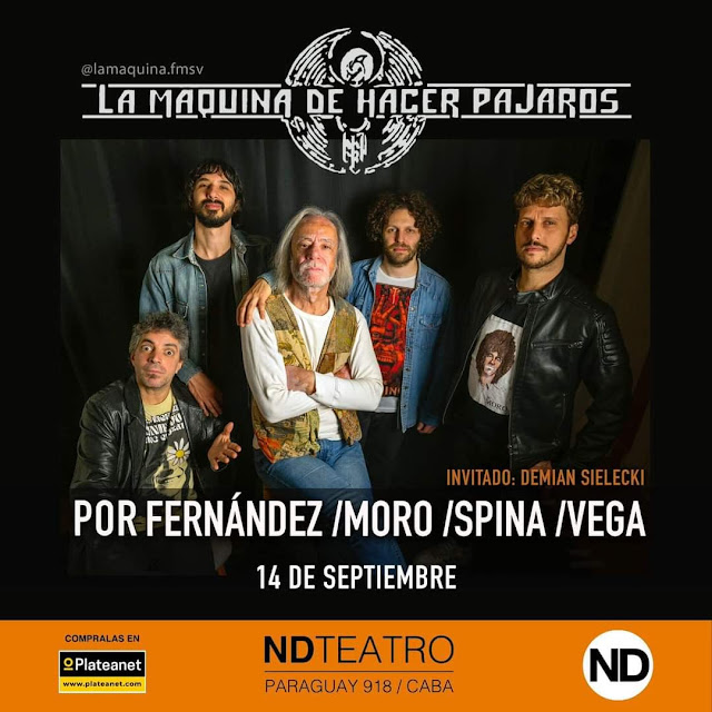 Anoche en un ND Ateneo colmado, tuvimos la posibilidad de disfrutar un concierto con el mejor ROCK PROGRESIVO, con la presentación en vivo de la renovada formación que tributa a: ¨ LA MÁQUINA DE HACER PÁJAROS. Con José Luis Fernández, el único miembro original, más el invalorable aporte de Juanito Moro en la batería y tres músicos jóvenes, super virtuosos: Guido Spina, Yani Matias Gonzalez Vega y Demian Sielecki.